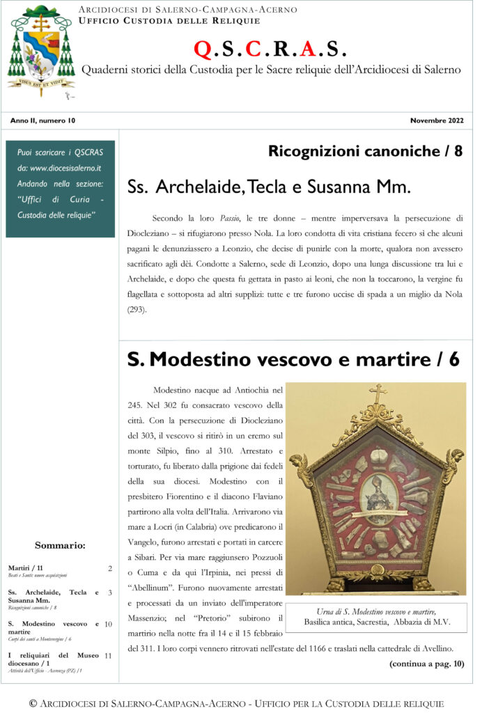 L’edizione QSCRAS numero 10 del mese di novembre 2022, apre la sua prima pagina con le reliquie di S. Modestino vescovo e martire, custodite presso l’Abbazia di Montevergine (Av) e le ricognizioni e di Ss. Archelaide, Tecla e Susanna Mm ...