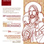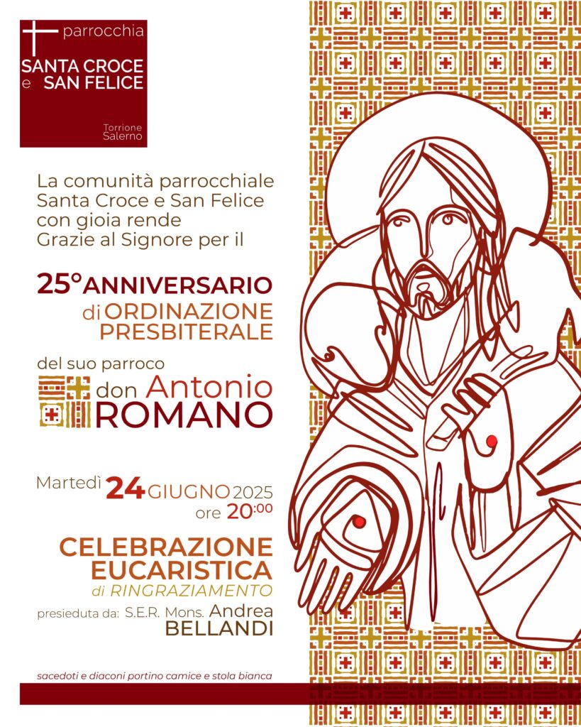Martedì 24 giugno alle ore 20.00 presso la Parrocchia Santa Croce e San Felice in Salerno si terrà la Celebrazione Eucaristica presieduta da S.E. Mons Andrea Bellandi in occasione del 25° anniversario di sacerdozio di don Antonio Romano.