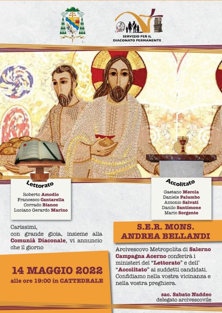 Sabato 14 maggio alle ore 19.00 presso la Cattedrale di Salerno il nostro Arcivescovo conferirà conferirà il ministero del Lettorato a Roberto Amodio, Francesco Cantarella, Corrado Bianco e Luciano Gerardo Marino e il ministero dell’Accolitato a Gaetano Merola, Daniele Palumbo, ...