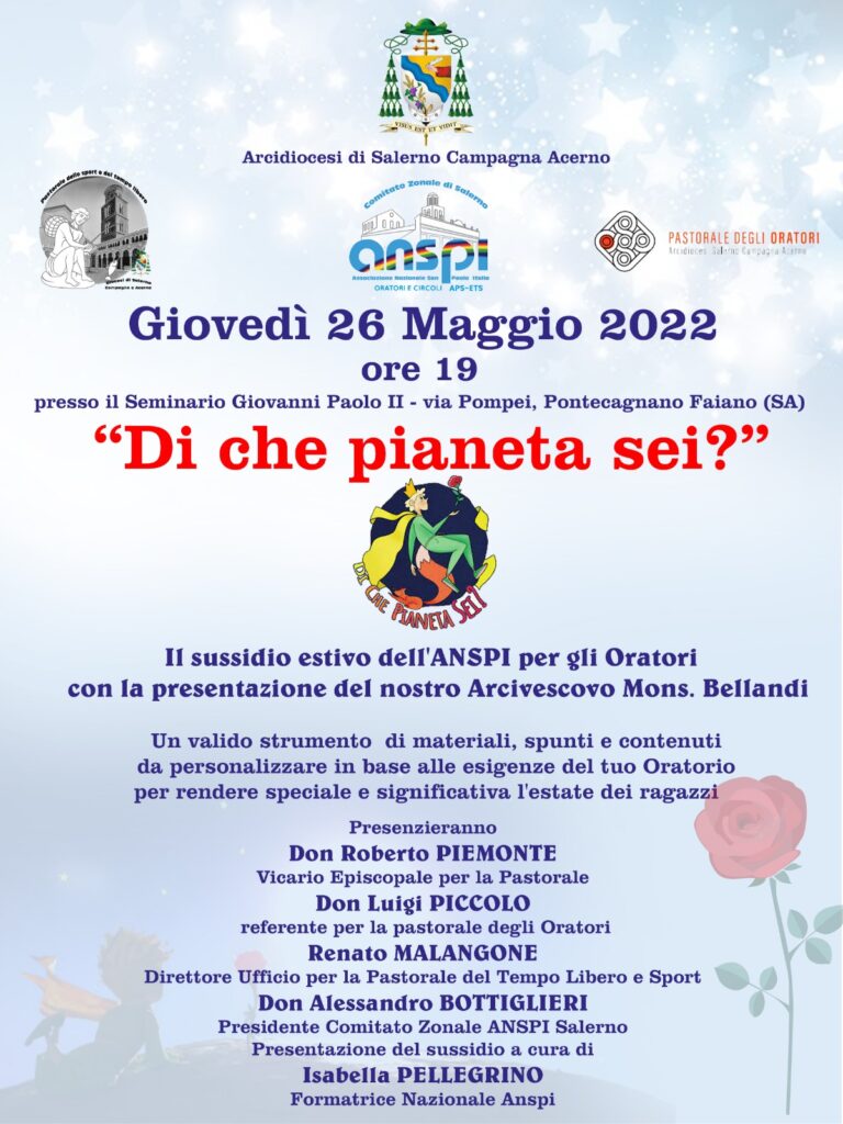 Giovedì 26 maggio alle ore 19.00 presso il Seminario Metropolitano Giovanni Paolo II si tiene la presentazione del sussidio estivo dell’Anspi per gli oratori dal titolo “Di che pianeta sei?” con la presentazione del nostro Arcivescovo S.E. Mons. Andrea Bellandi. ...