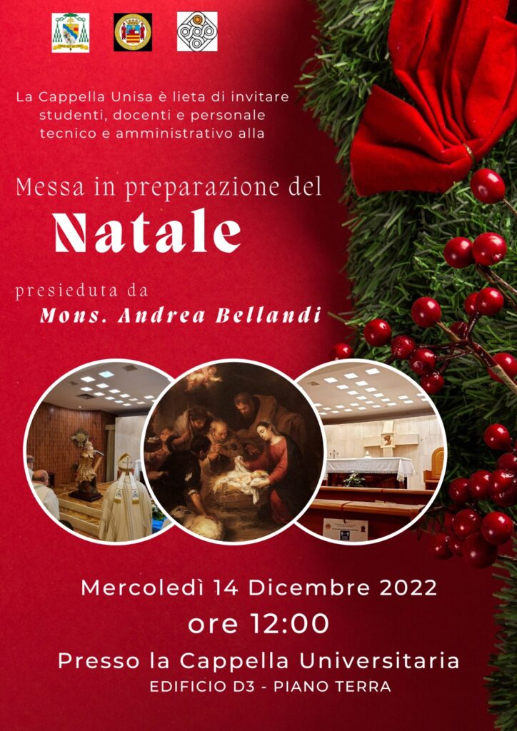 Mercoledì 18 dicembre alle ore 12.00 presso la cappella universitaria dell’Unisa S.E. Mons. Andrea Bellandi presiede la Celebrazione Eucaristica in preparazione al Natale.