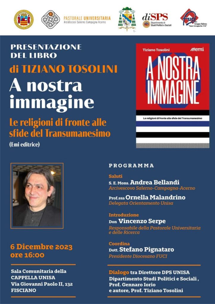 Mercoledì 6 dicembre alle ore 16.00, nella Sala Comunitaria della Cappella Unisa si terrà la presentazione del libro di Tiziano Tolsolini dal titolo “A nostra immagine, le religioni di fronte alle sfide del Transumanesimo”. Interverranno: S.E. Mons Andrea Bellandi Prof.ssa Ornella ...