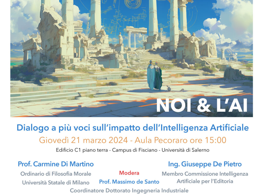 La Pastorale Universitaria propone un incontro dal titolo “NOI & L’AI – Dialogo a più voci sull’impatto dell’Intelligenza Artificiale” che si terrà nell’Aula Pecoraro al campus di Fisciano. Realtori e animatori del dibattito: il prof. Carmine Di Martino (Ordinario di Filosofia ...