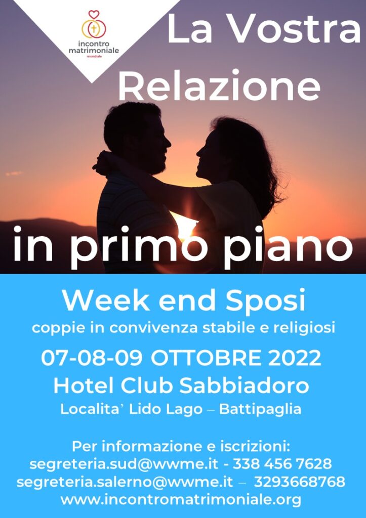 Da venerdì sera 11 novembre a domenica pomeriggio 13 novembre, presso l’Hotel Sabbiadoro di Battipaglia, si terrà un week-end per fidanzati. Esso ha la finalità di aiutare i fidanzati, singolarmente e in coppia, a verificare la conoscenza di sé per ...
