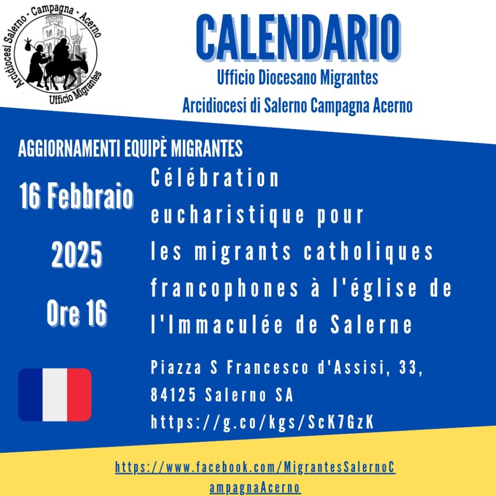 L’Ufficio Diocasano Migrantes annuncia con gioia una Celebrazione Eucaristica in lingua francese, dedicata alla comunità migrante francofona presente sul nostro territorio. L’evento si terrà domenica 16 febbraio alle ore 16.00, presso la Chiesa dell’Immacolata a Salerno. Questa iniziativa nasce dal ...