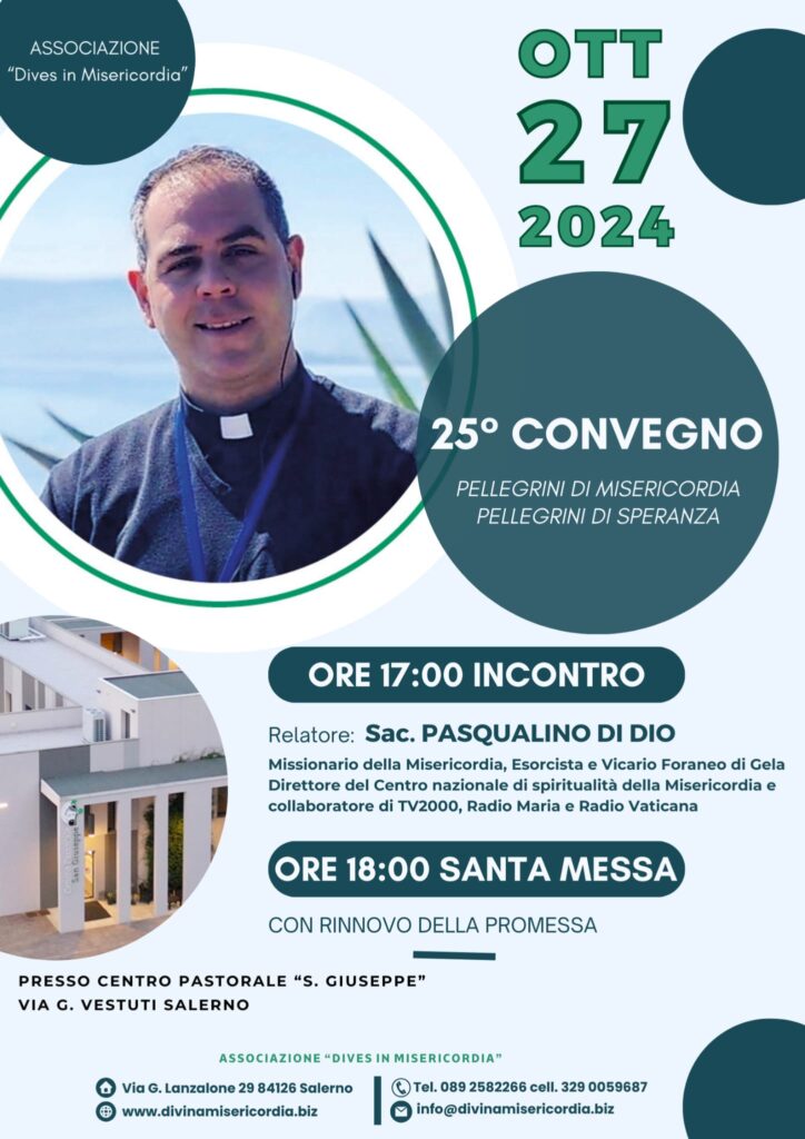 Domenica 27 ottobre, alle ore 17.00, presso il Centro Pastorale “San Giuseppe” di Pastena, Salerno, si terrà il 25esimo Convegno Pellegrini di Misericordia Pellegrini di Speranza, organizzato dall’associazione “Dives in Misericordia”. L’evento si aprirà con una relazione tenuta da don ...