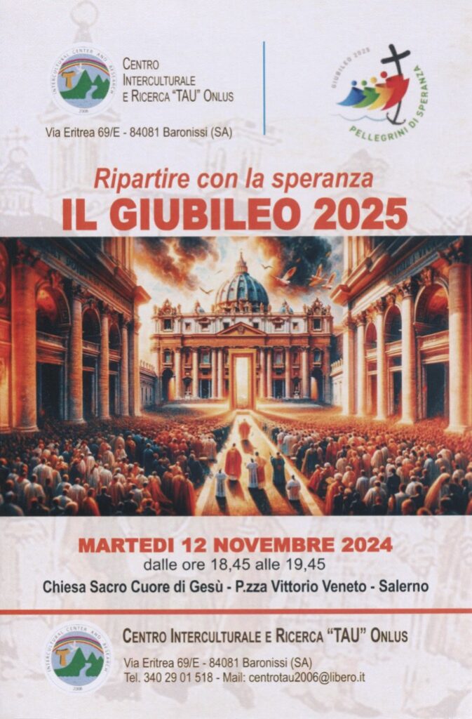 Il Centro Tau Onlus propone un incontro di ascolto e formazione dal titolo “Ripartire dalla speranza. Il Giubileo 2025”. Avrà luogo martedì 12 novembre alle ore 18.45, presso la parrocchia Sacro Cuore di Gesù di Salerno.