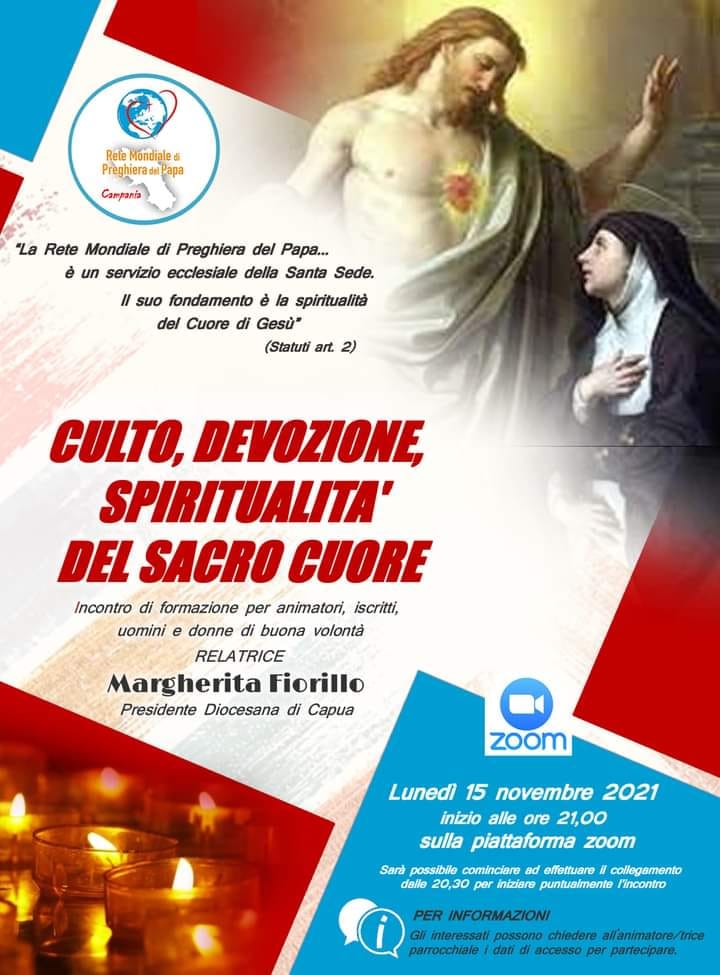 Lunedì 15 novembre ore 21.00 si tiene un incontro di formazione per animatori dal titolo “Culto, devozione, spiritualità del Sacro Cuore” relaziona Margherita Fiorillo, presidente diocesana di Capua, organizzato dalla Rete Mondiale di preghiera del Papa della regione Campania. ...