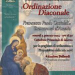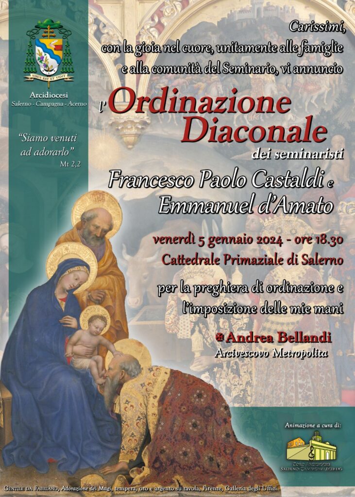 Venerdì 5 gennaio alle ore 18.30 presso la Cattedrale dei Santi Matteo e Gregorio Magno in Salerno, per l’imposizione delle mani e la preghiera consacratoria di S.E. Mons. Andrea Bellandi, verranno ordinati Diaconi i seminaristi Francesco Paolo Castaldi e Emmanuel ...