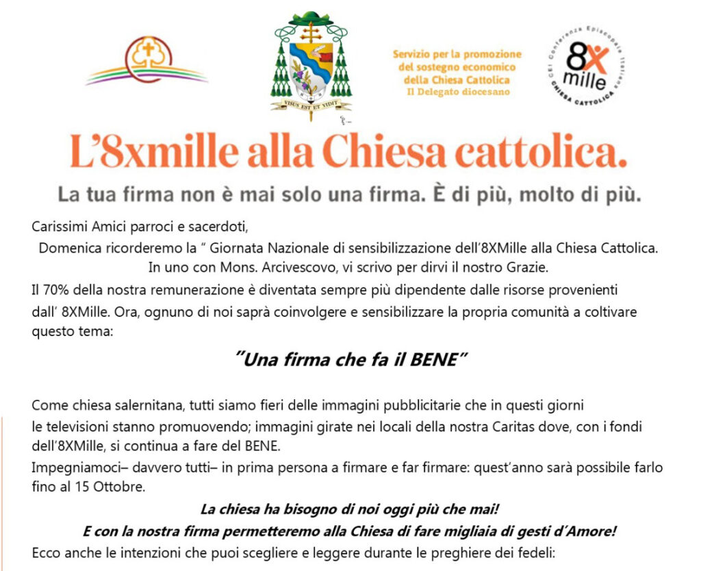 Giovedì 16 maggio, alle ore 20.15 il Servizio diocesano del Sovvenire organizza un incontro presso la parrocchia Volto Santo di Salerno per promuovere la campagna di sensibilizzazione Cei sulla gestione dei fondi 8X1000 e sulla risposta concreta della chiesa alle necessità del territorio.