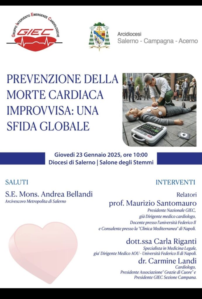 Giovedì 23 gennaio alle ore 10.00 nel Salone degli Stemmi del Palazzo Arcivescovile di Salerno si terrà un convegno dal titolo “Prevenzione della morte cardiaca improvvisa: una sfida globale” organizzato dal Gruppo Intervento Emergenze Cardiologiche (GIEC). Dopo i saluti di ...