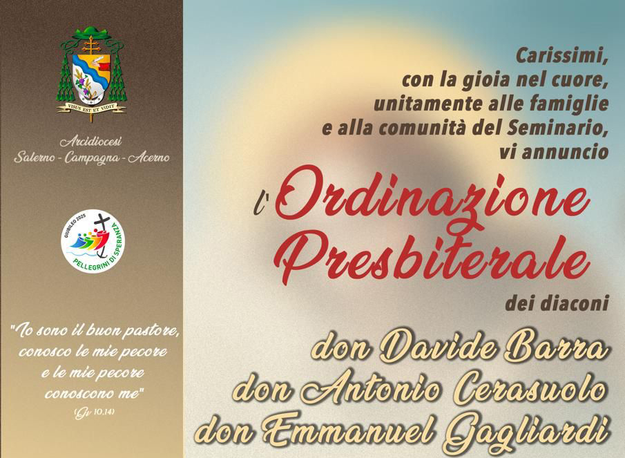 Mercoledì 30 aprile p.v. alle ore 18.30 presso la Cattedrale di Salerno saranno ordinati presbiteri i diaconi don Davide Barra, don Antonio Cerasuolo e don Emmanuel Gagliardi per l’imposizione delle mani e la preghiera consacratoria di S.E. Mons. Andrea Bellandi. ...