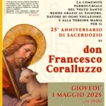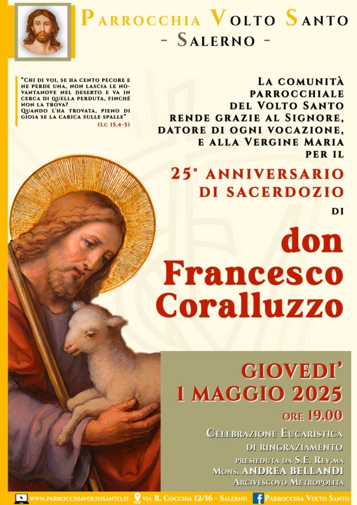 Giovedì 1 maggio alle ore 19.00 presso la Parrocchia Volto Santo in Salerno si terrà la Celebrazione Eucaristica la presieduta da S.E. Mons Andrea Bellandi in occasione del 25° anniversario di sacerdozio di don Francesco Coralluzzo.