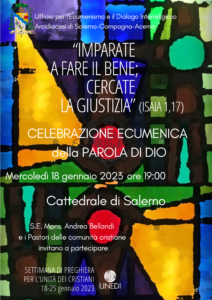 Mercoledì 18 gennaio alle ore 19.00 presso la Cattedrale di Salerno si terrà la celebrazione ecumenica della Parola di Dio presieduta da S.E. Mons. Andrea Bellandi e dai pastori delle comunità.