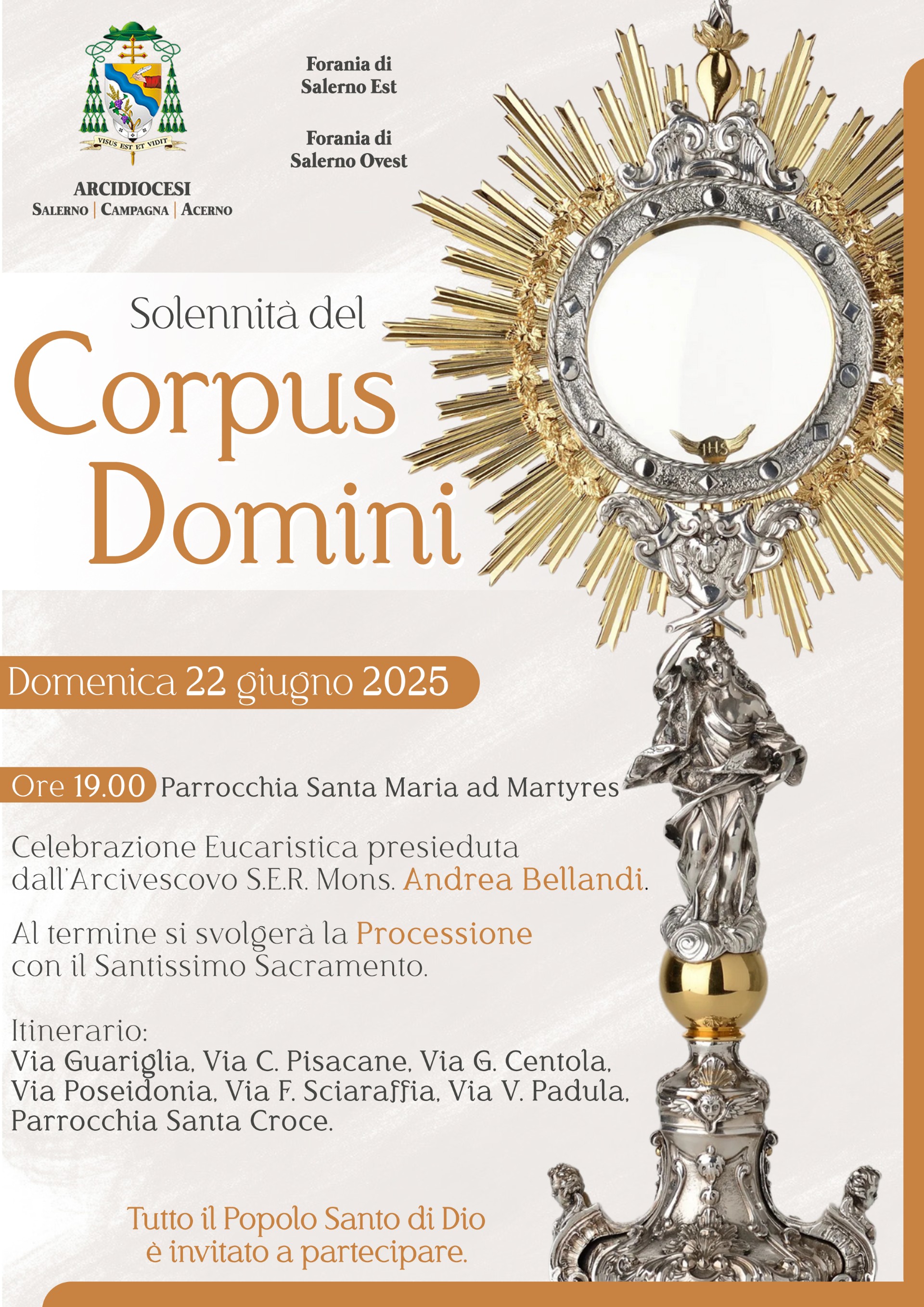Domenica 22 giugno, solennità del Corpus Domini, alle ore 19.00, presso la parrocchia Santa Maria ad Martyres di Salerno, l’Arcivescovo Andrea presiederà la Celebrazione Eucaristica alla quale concelebreranno i parroci e i presbiteri delle Foranie di Salerno-est e di Salerno-ovest. Seguirà la Processione Eucaristica secondo il seguente itinerario: Via Guariglia, Via C. Pisacane, Via G. Centola, Via Poseidonia, Via F. Sciaraffia, Via V. Padula. Essa si concluderà nella Parrocchia Santa Croce.