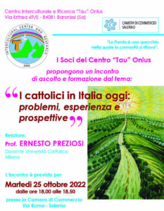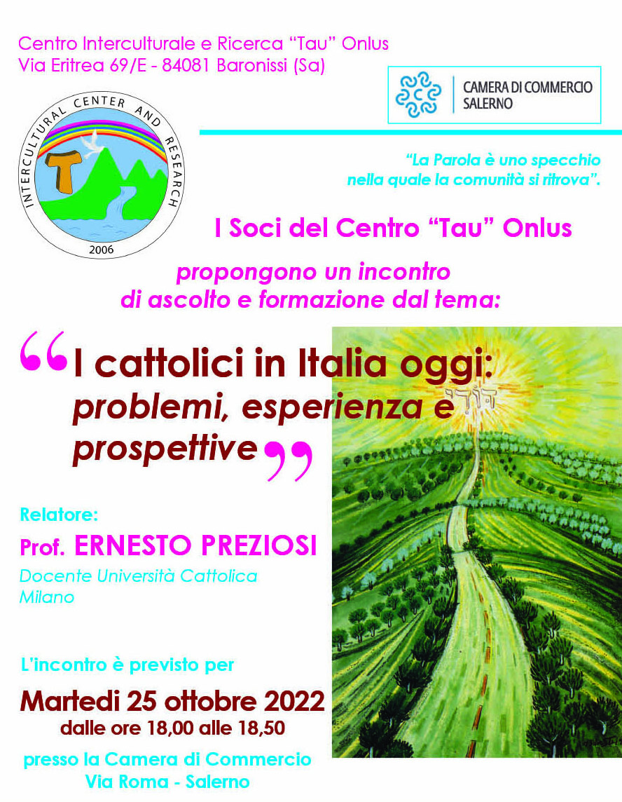Martedì 25 ottobre alle ore 18.00 presso la Camera di Commercio di Salerno si tiene un incontro dal tema “I cattolici in Italia oggi: problemi, esperienza e prospettive” organizzato dal Centro Interculturale e ricerca “Tau” Onlus, relaziona il prof. Ernesto Preziosi, docente dell’Università Cattolica di Milano.