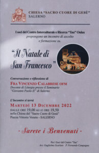 Martedì 13 dicembre alle ore 19.00 presso la parrocchia Sacro Cuore di Gesù di Salerno si tiene un incontro di preparazione al Natale dal titolo “Il Natale di San Francesco” organizzato dal Centro Interculturale e Ricerca Tau Onlus. Conversazione riflessione a cura di P. Vincenzo Calabrese Ofm.