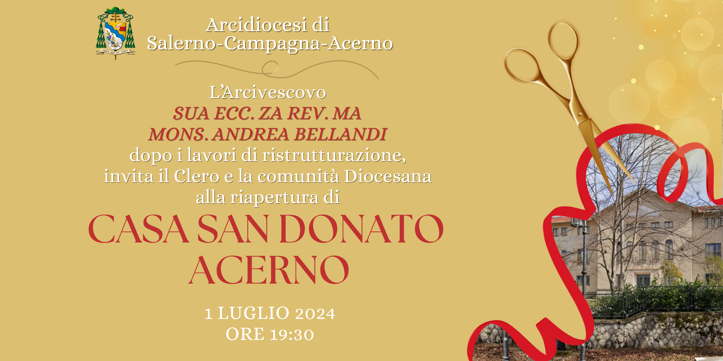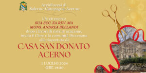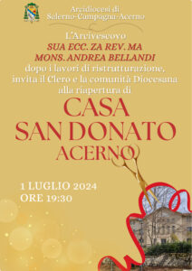 Lunedì 1 luglio alle ore 19.30, dopo un periodo di chiusura necessario per importanti lavori di ristrutturazione riapre le porte Casa San Donato di Acerno. S.E. Mons. Andrea Bellandi invita il Clero e l’intera comunità diocesana a partecipare alla cerimonia di apertura.