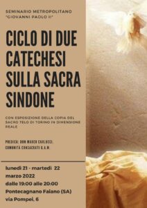 Lunedì e martedì 21 e 22 marzo alle ore 19.00 presso il Seminario Metropolitano “Giovanni Paolo II”si tiene un ciclo di due catechesi sulla Sacra Sindone con esposizione della copia del Sacro telo di Torino in dimensione reale.