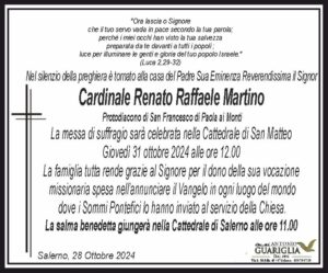 Giovedì 31 ottobre, la salma del Cardinale Renato Raffaele Martino giungerà nella Cattedrale di Salerno alle ore 11.00, dove sarà accolta per un momento di raccoglimento. Alle ore 12.00, seguirà la celebrazione della messa di suffragio in suo onore.