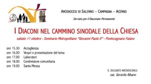 Sabato 11 ottobre p.v. presso il Seminario Metropolitano “Giovanni Paolo II” di Pontecagnano Faiano (SA) la Comunità diaconale dell’Arcidiocesi vivrà un momento di riflessione, fraternità e preghiera in sintonia con il percorso sinodale della Chiesa universale, insieme al Delegato Arcivescovile per il Diaconato Permanente, don Gerardo Albano