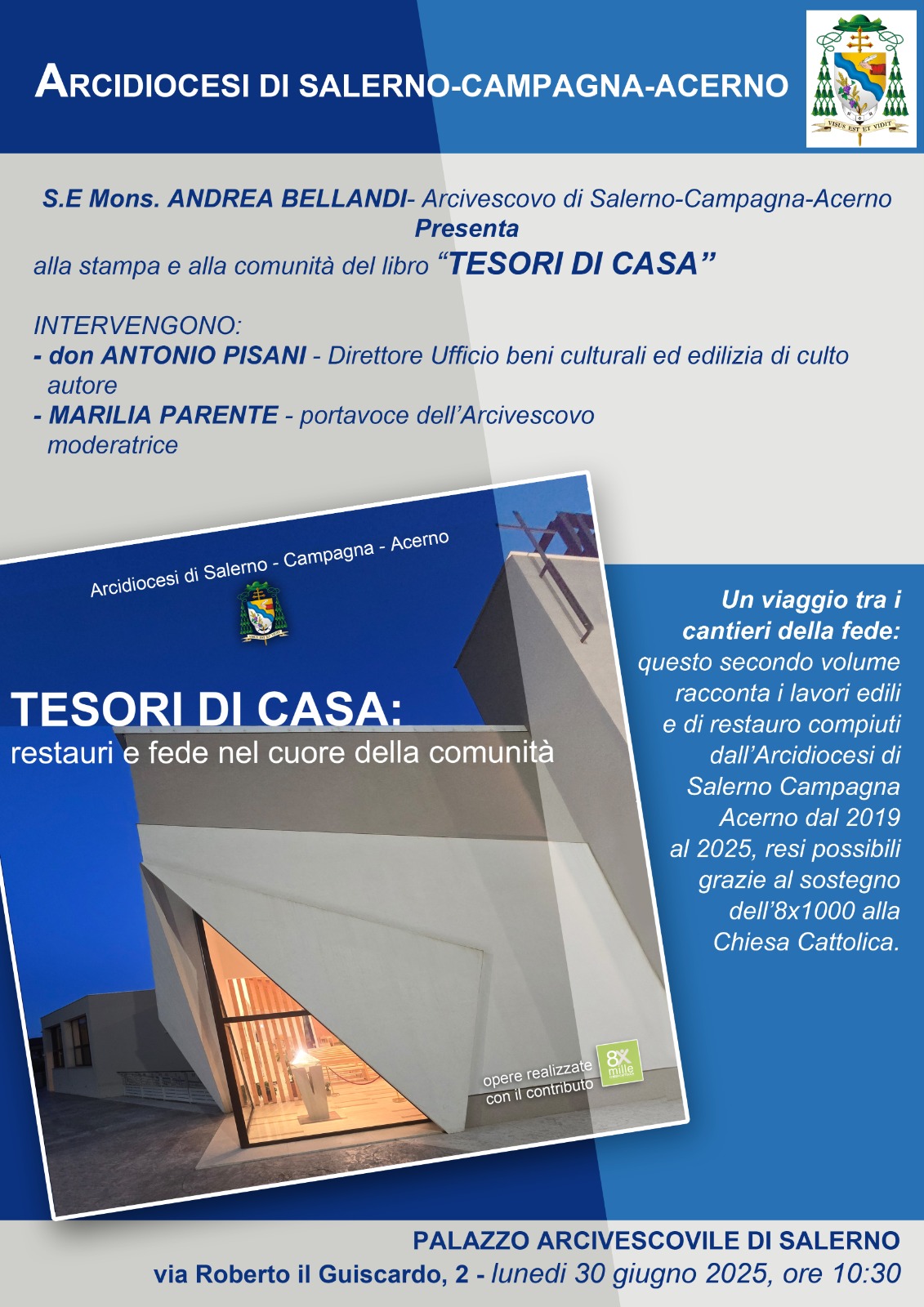 È in programma lunedì 30 giugno 2025, alle ore 10.30, presso il Salone degli Stemmi del Palazzo Arcivescovile di Salerno, la conferenza stampa di presentazione di “Tesori di Casa”, libretto sugli interventi che negli anni 2019-2025 hanno interessato gli edifici, i beni culturali ecclesiastici, la nuova edilizia di culto e le case canoniche dell’Arcidiocesi di Salerno-Campagna-Acerno, con il contributo dell’8×1000 alla Chiesa Cattolica.