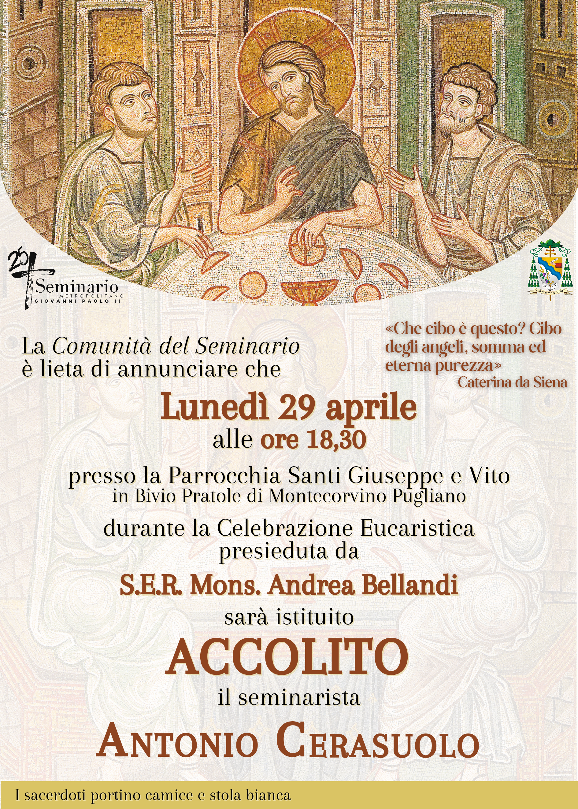 Lunedì 29 aprile p.v., presso la Parrocchia Santi Giuseppe e Vito in Bivio Pratole in Montecorvino Pugliano alle ore 18.30 sarà istituito accolito il seminarista Antonio Cerasuolo durante la Solenne Celebrazione Eucaristica presieduta da S.E. Mons. Andrea Bellandi.