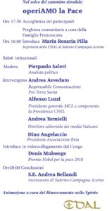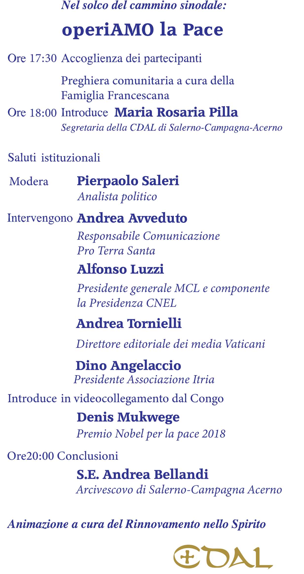 Un appuntamento promosso ed organizzato dalla Consulta delle Aggregazioni Laicali della Arcidiocesi di Salerno-Campagna-Acerno nel quale, moderati da Pierpaolo Saleri e dopo l’introduzione della segretaria diocesana della CDAL, Maria Rosaria Pilla, interverranno: Andrea Avveduto, responsabile comunicazione Pro Terra Santa; Alfonso Liuzzi, presidente generale MCL; Andrea Tornielli, direttore editoriale dei media vaticani; Dino Angelaccio, presidente associazione Itria; in videocollegamento Denis Mukwege, premio Nobel per la Pace 2018 e, infine, le conclusioni di S.E. Mons. Andrea Bellandi.