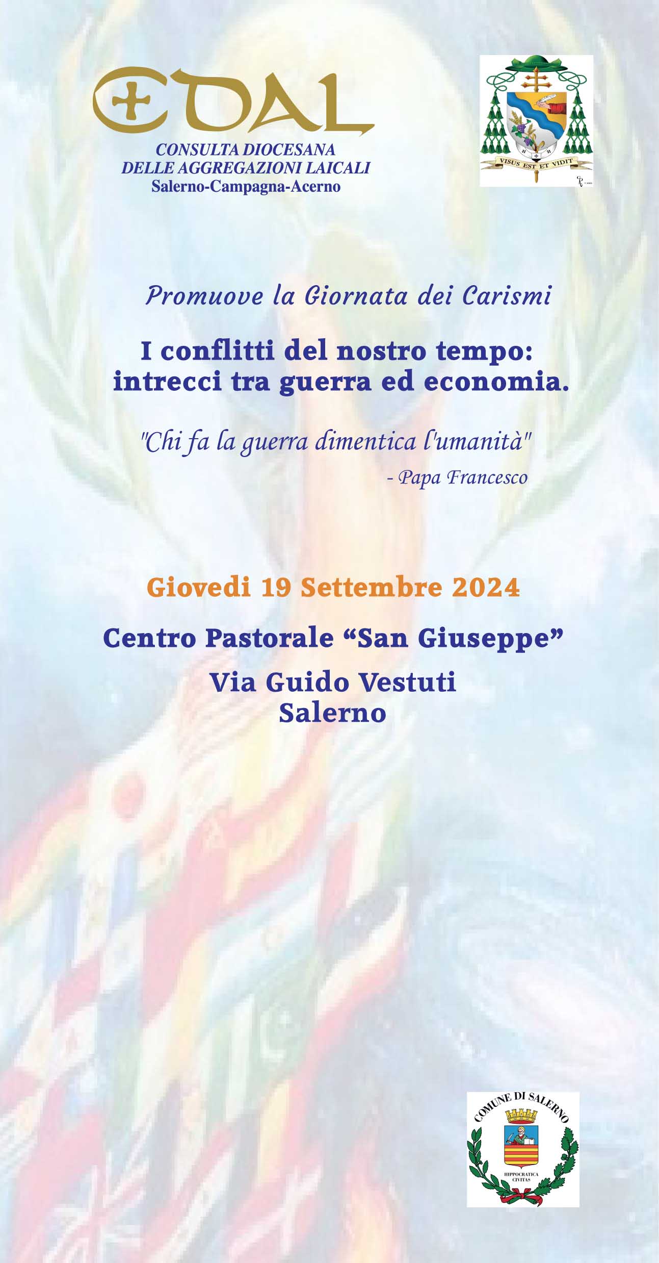 Giovedì 19 settembre, alle ore 17.30 presso il Centro Pastorale “San Giuseppe”, Pastena, Salerno si terrà un incontro per promuovere la Giornata dei Carismi dal titolo “I conflitti del nostro tempo: intrecci tra guerra ed economia”.