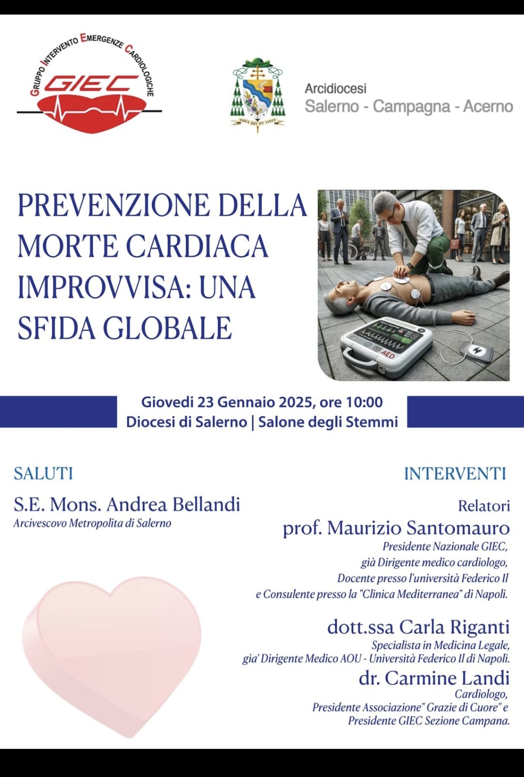 Giovedì 23 gennaio alle ore 10.00 nel Salone degli Stemmi del Palazzo Arcivescovile di Salerno si terrà un convegno dal titolo “Prevenzione della morte cardiaca improvvisa: una sfida globale” organizzato dal Gruppo Intervento Emergenze Cardiologiche (GIEC).