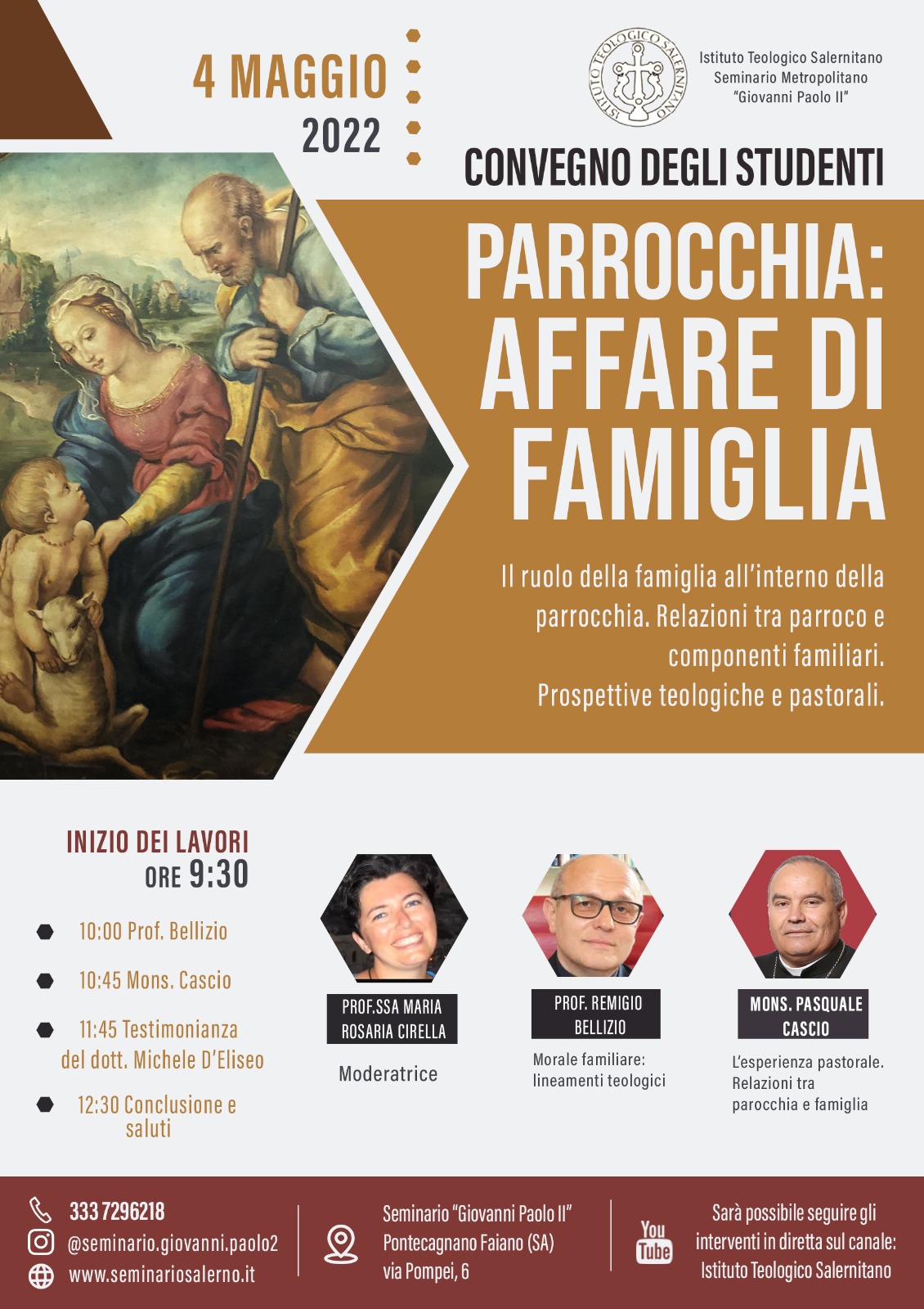 Mercoledì 4 maggio dalle ore 9.30 si tiene il Convegno degli studenti dell’Istituto Teologico Salernitano presso il Seminario Metropolitano Giovanni Paolo II dal tema “Parrocchia: affare di famiglia. Il ruolo della famiglia all’interno della parrocchia. Relazioni tra parroco e componenti familiari. Prospettive teologiche e pastorali.