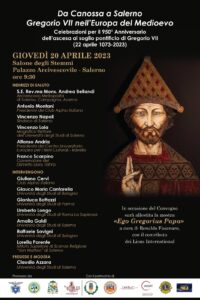 A 950 anni dall’ascesa di Gregorio VII al soglio pontificio, a Salerno, presso il Palazzo Arcivescovile, il 20 aprile alle ore 9.30 si svolgerà un Convegno nazionale dal titolo “Gregorio VII nell’Europa del Medioevo”, promosso e organizzato dal CAI (Club Alpino Italiano), in collaborazione con i Dipartimenti di Scienze del Patrimonio Culturale (DiSPaC) e di Scienze Umane, Filosofiche e della Formazione (DiSUFF) dell’Università degli Studi di Salerno e con l’Ufficio Cultura e Arte dell’Arcidiocesi Salerno-Campagna-Acerno.