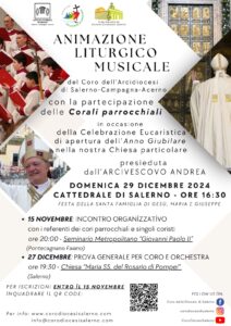 In occasione della Solenne Apertura dell’Anno Santo Giubilare nella nostra Arcidiocesi, tutti i cori sono invitati a partecipare alla Celebrazione di apertura, il 29 dicembre 2024 alle 16.30 presso la Cattedrale di Salerno. Ogni coro dovrà registrarsi entro il 15 novembre. Inoltre, il 15 novembre si terrà un incontro al Seminario di Pontecagnano per condividere il repertorio e le linee guida, seguito da una prova generale il 27 dicembre a Salerno. Questa è un’opportunità importante per condividere un momento saliente dell’Anno Giubilare e della vita diocesana uniti nella preghiera e nella musica.