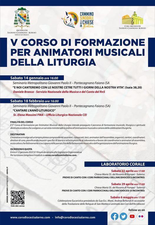 Torna il “Corso di formazione per animatori musicali della liturgia” giunto ormai alla sua quinta edizione. Il percorso formativo, organizzato dal Coro dell’Arcidiocesi di Salerno-Campagna-Acerno, è destinato a tutti coloro i quali svolgono un servizio ministeriale in ordine all’animazione musicale e canora delle celebrazioni liturgiche. L’obiettivo è quello di coinvolgere sacerdoti, consacrati, laici, animatori dell’assemblea, organisti, cantori, coordinatori, direttori ma anche appassionati di musica e liturgia.