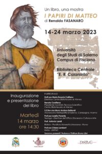 Il Vangelo di Matteo approda all’Università degli Studi di Salerno: si terranno martedì 14 marzo, alle ore 14.30, infatti, nella biblioteca Centrale “E.R. Caianiello” dell’Ateneo di Fisciano, l’inaugurazione della mostra intitolata “I Papiri di Matteo” e la presentazione dell’omonimo libro, a cura di Renaldo Fasanaro. Entusiasta dell’iniziativa organizzata in collaborazione con l’Università, l’Arcivescovo di Salerno-Campagna-Acerno, Sua Eccellenza Monsignor Andrea Bellandi: “La mostra e la presentazione del libro rappresentano una giusta apertura, da parte del mondo universitario, alle acquisizioni scientifiche che anche i testi sacri hanno offerto”, ha osservato Sua Eccellenza Bellandi.