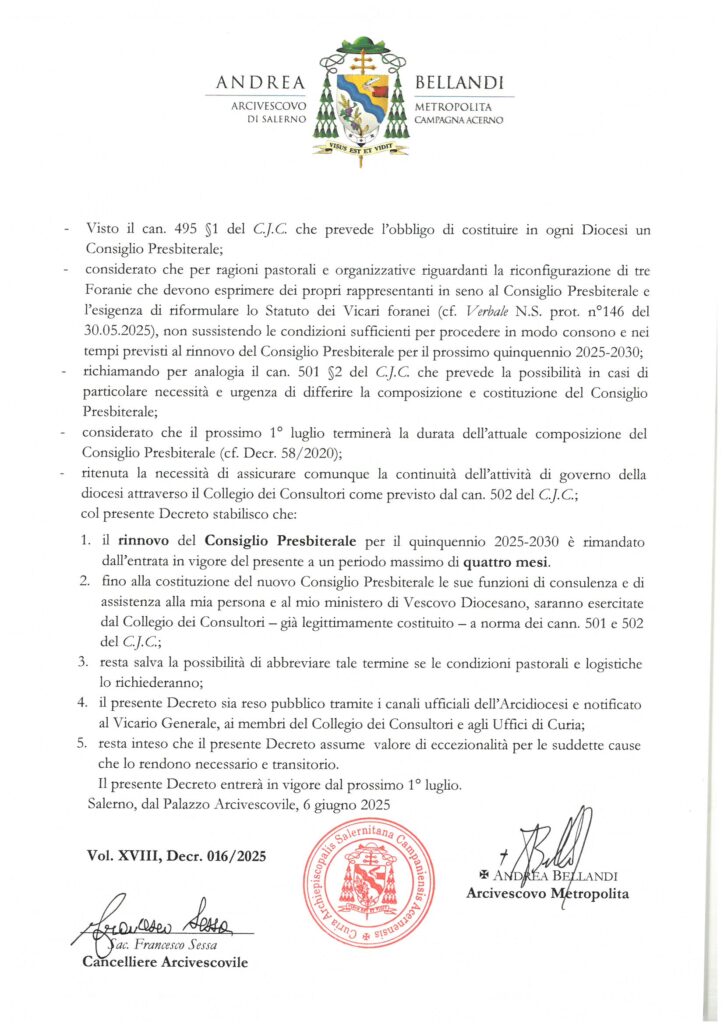 - il rinnovo del Consiglio Presbiterale per il quinquennio 2025-2030 è rimandato dall’entrata in vigore del presente a un periodo massimo di quattro mesi.