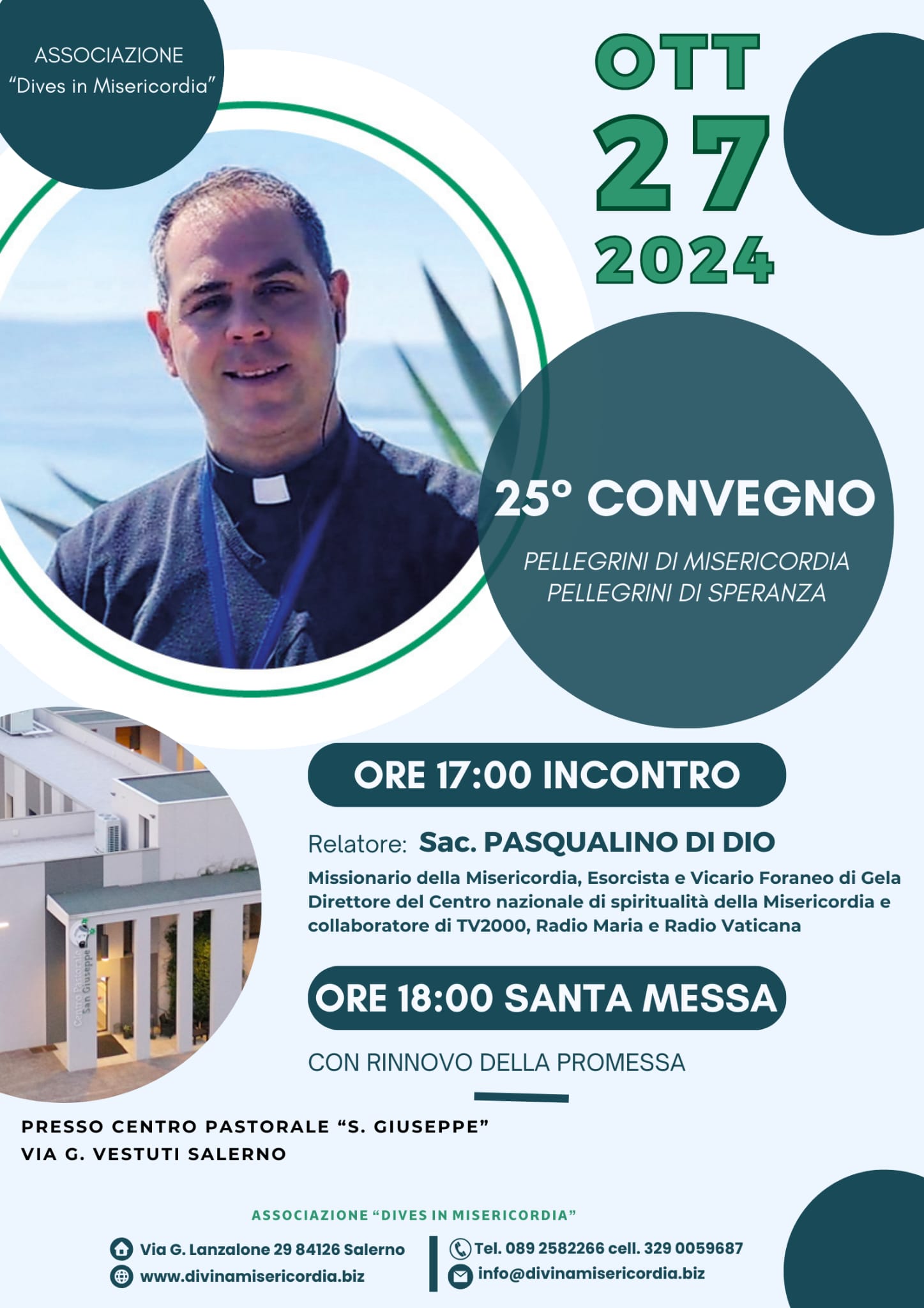 Domenica 27 ottobre, alle ore 17.00, presso il Centro Pastorale “San Giuseppe” di Pastena, Salerno, si terrà il 25esimo Convegno Pellegrini di Misericordia Pellegrini di Speranza, organizzato dall’associazione “Dives in Misericordia”. L’evento si aprirà con una relazione tenuta da don Pasqualino di Dio, direttore del Centro nazionale di spiritualità della Misericordia. Il convegno culminerà con la Celebrazione Eucaristica delle ore 18.00, al termine della quale ci sarà il rinnovo della promessa dei pellegrini.