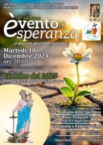 Martedì 10 dicembre alle ore 20.00, presso la parrocchia S. Maria della Speranza, la forania di Battipaglia e Olevano Sul Tusciano, in collaborazione con l’Arcidiocesi di Salerno-Campagna-Acerno, organizza una serata dedicata alla speranza, in preparazione al Giubileo del 2025.