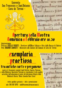 Presso il convento San Francesco e Sant’Antonio di Cava de’ Tirreni, domenica 6 febbraio alle 16.30 si aprirà la mostra “Exemplaria praetiosa”, un’esposizione di antichi e importanti documenti della storia della Chiesa appartenenti all’Archivio Segreto Vaticano e alla Biblioteca Apostolica Vaticana. Tra questi, anche il celebre “Dictatus papae” di Gregorio VII, le cui spoglie mortali riposano nella Cattedrale di Salerno.