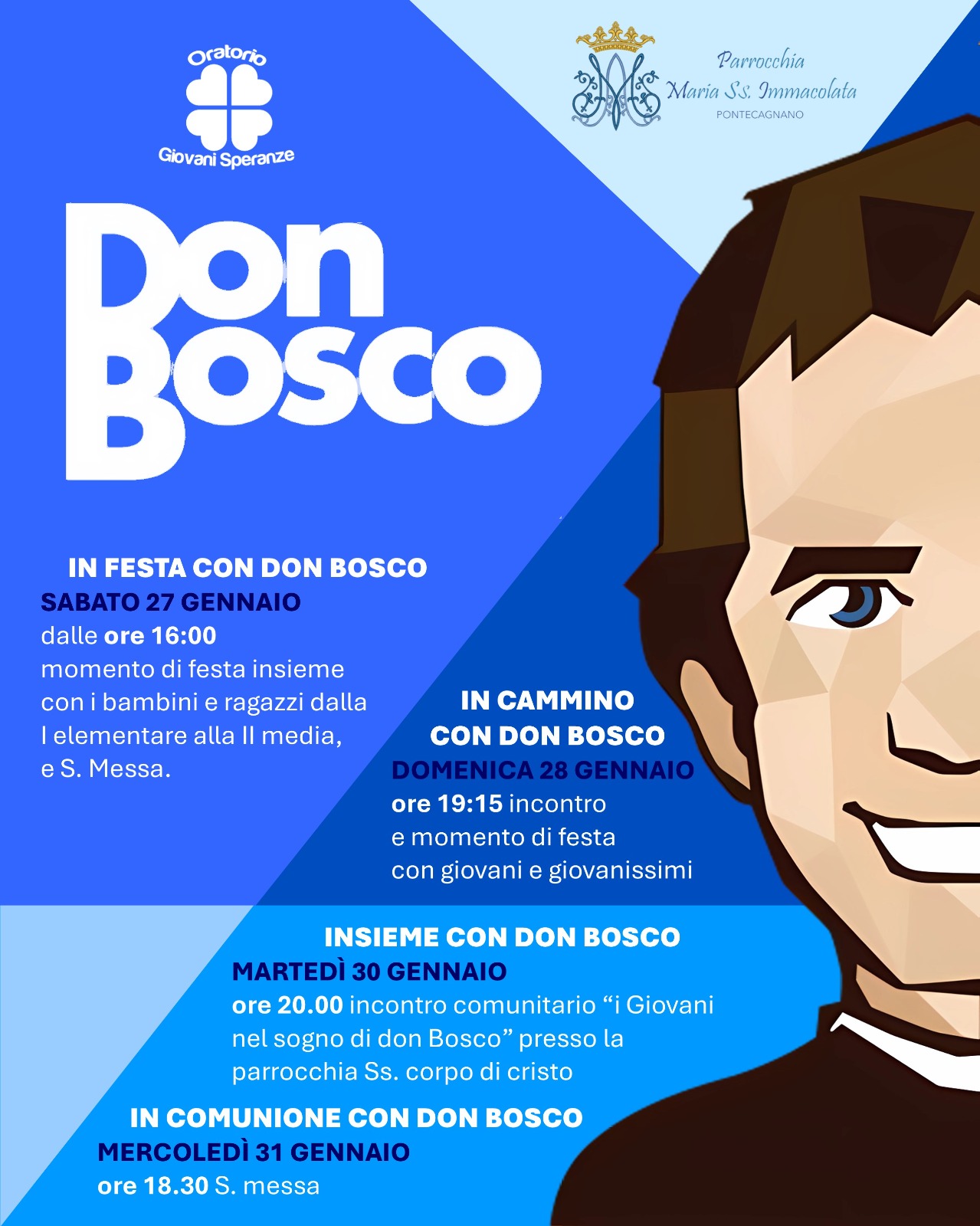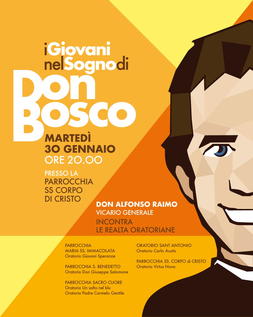 Martedì 30 gennaio alle ore 20.00, presso la parrocchia Ss. Corpo di Cristo in Pontecagnano, il vicario generale, don Alfonso Raimo, partecipa all’incontro comunitario delle realtà oratoriane di Pontecagnano in occasione della Festa di San Giovanni Bosco. Un incontro rivolto non solo ai giovani e giovanissimi ma anche agli animatori e ai collaboratori degli Oratori.