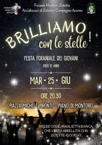 Martedì 25 giugno alle ore 20.30 in piazza Michele Pironti a Piano di Montoro si terrà la Festa Foraniale dei Giovani, un momento di annuncio, condivisione e convivialità. Un appuntamento organizzato dalla Forania di Montoro-Solofra ricco di testimonianze, musica, ballo e tante altre sorprese..