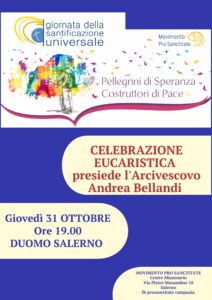 In occasione della Giornata della Santificazione Universale, giovedì 31 ottobre, alle ore 19.00, presso la Cattedrale di Salerno avrà luogo la Celebrazione Eucaristica presieduta da S.E. Mons. Andrea Bellandi.