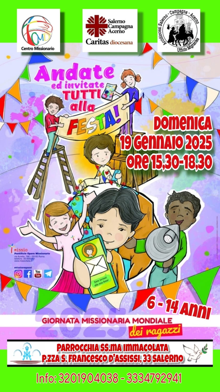 Domenica 19 gennaio alle ore 15.30 presso la parrocchia Maria SS.ma Immacolata in Salerno si terrà la Giornata dell’Infanzia Missionaria dei Ragazzi. Raccogliendo i frutti del cammino sinodale, l’evento è organizzato in sinergia tra gli Uffici della Caritas, Migrantes e Cooperazione tra le Chiese, nonché dai giovani della Gi.Fra. della comunità ospite. L’evento si rivolge alla fascia di età che va dai 6 ai 14 anni.