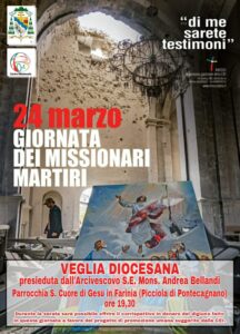 Venerdì 24 marzo alle ore 19.30, il Centro Missionario Diocesano, coadiuvato dalla comunità ospitante del Sacro Cuore di Gesù in Farinia di Picciola di Pontecagnano, organizza la veglia diocesana per la Giornata di preghiera e di digiuno dei Missionari Martiri, che sarà presieduta dal nostro Arcivescovo.