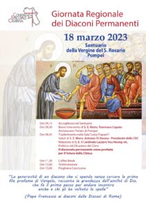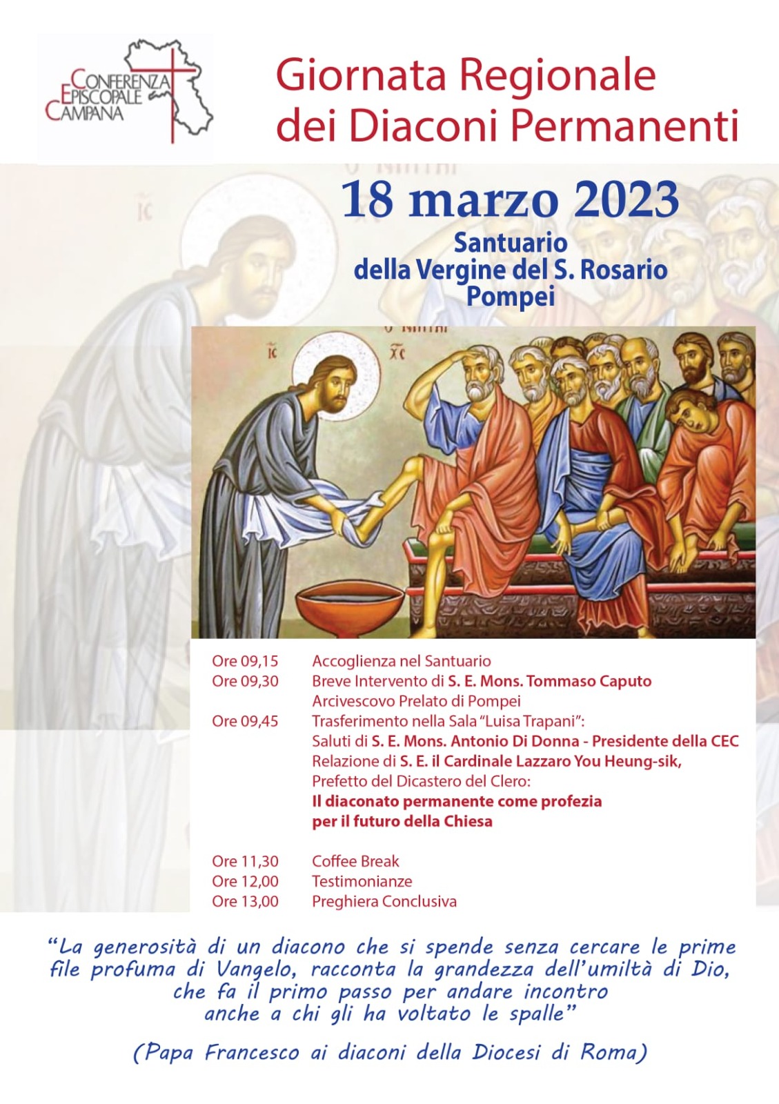 Sabato 18 marzo dalle ore ore 9.00 bel Santuario della Beata Vergine Maria del Santo Rosario di Pompei si tiene la Giornata regionale dei diaconi permanenti. L’incontro è rivolto ai diaconi, consorti, a quanti sono in cammino e ai sacerdoti che lo desiderano.