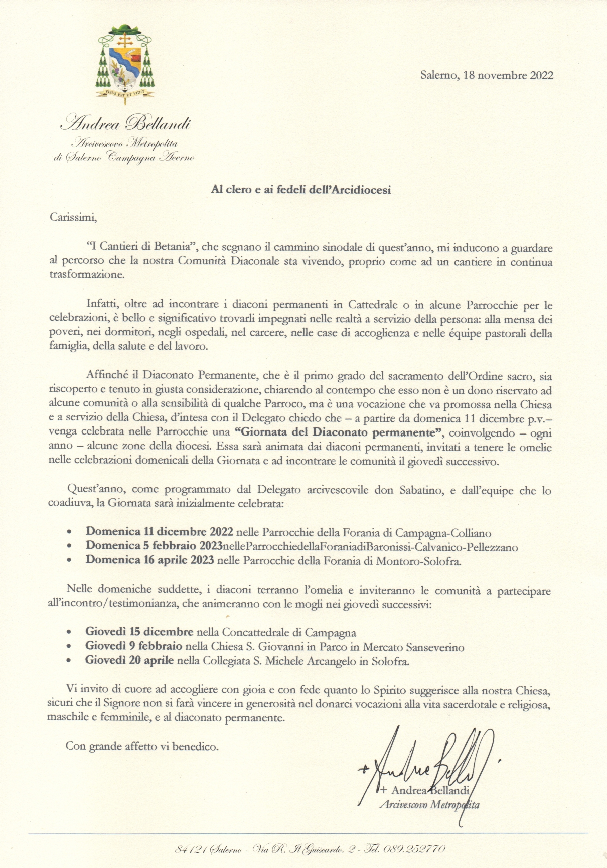 Da domenica 5 febbraio p.v. nelle parrocchie della Forania di Baronissi-Calvanico-Pellezzano verrà celebrata la “Giornata del Diaconato permanente” che sarà animata dai diaconi permanenti, invitati a tenere le omelie nelle celebrazioni domenicali della Giornata e ad incontrare le comunità il giovedì successivo.