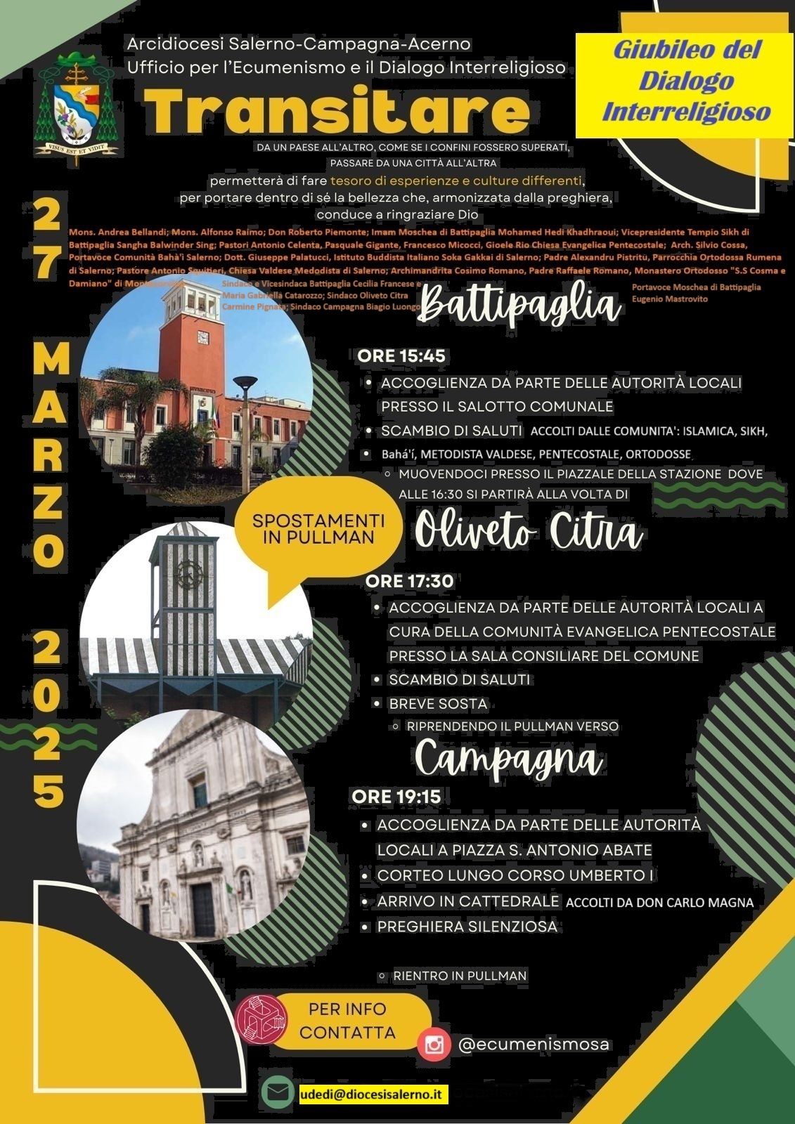 - Oliveto Citra, ore 17.30: Accoglienza a cura della comunità evangelica pentecostale presso la Sala Consiliare del Comune, con un ulteriore scambio di saluti.