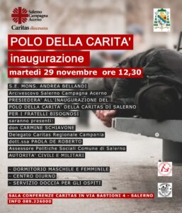 Martedì 29 novembre, alle ore 12.30 presso il salone delle conferenze della Caritas di Salerno, in via Bastioni 4 a Salerno, sarà inaugurato il Polo della Carità, sorto per dare ristoro ai fratelli bisognosi.