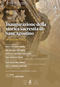 Martedì 28 giugno, alle ore 19.30, presso la Chiesa di S. Agostino, inaugurazione della storica sacrestia di Sant’Agostino alla presenza di autorità, maestranze e fedeli.