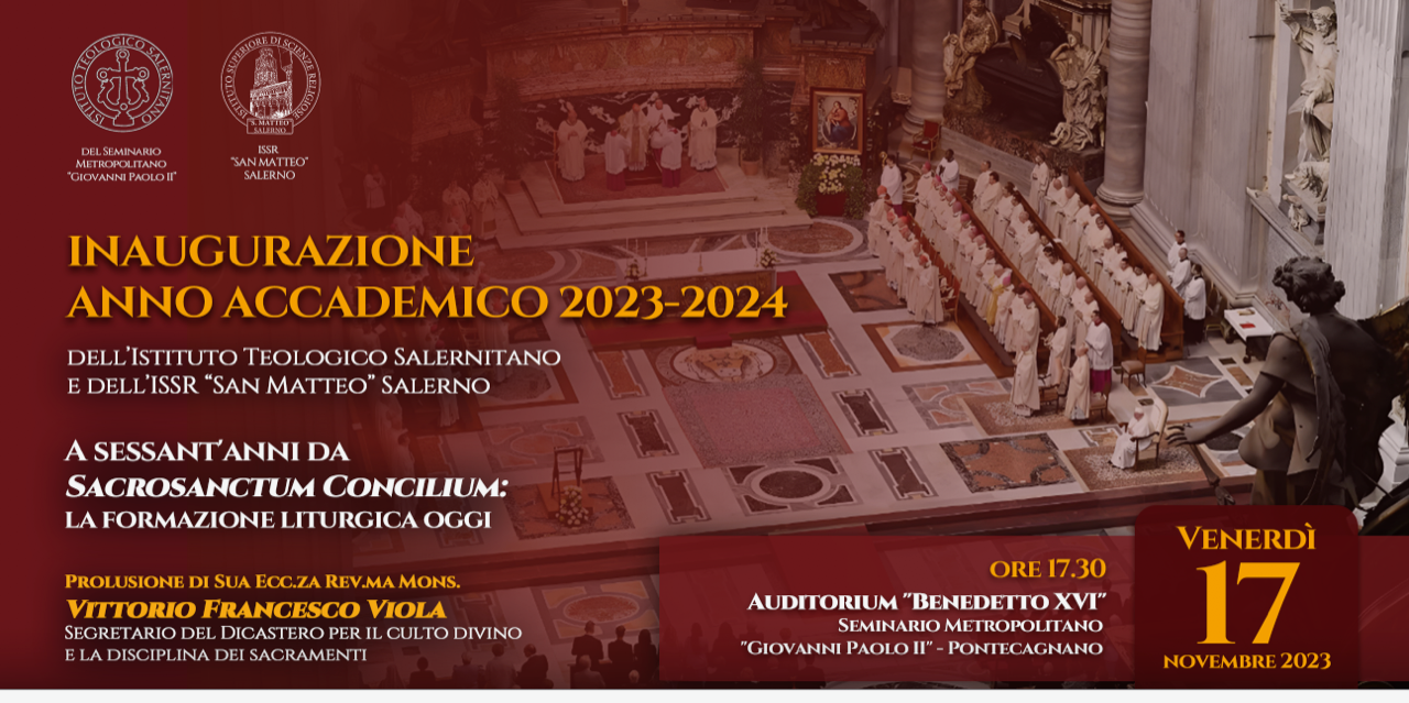 Venerdì 17 novembrealle ore 17.30 si terrà l’inaugurazione dell’anno accademico 2023/2024 dell’Istituto di Scienze Religiose “San Matteo” e dell’Istituto teologico Salernitano (Seminario) presso l’auditorium “Benedetto XVI” del Seminario Metropolitano “Giovanni Paolo II”. Prolusione Accademica di S.E. Mons. Vittorio Francesco Viola, segretario del Dicastero per il Culto Divino e la Disciplina dei Sacramenti.
